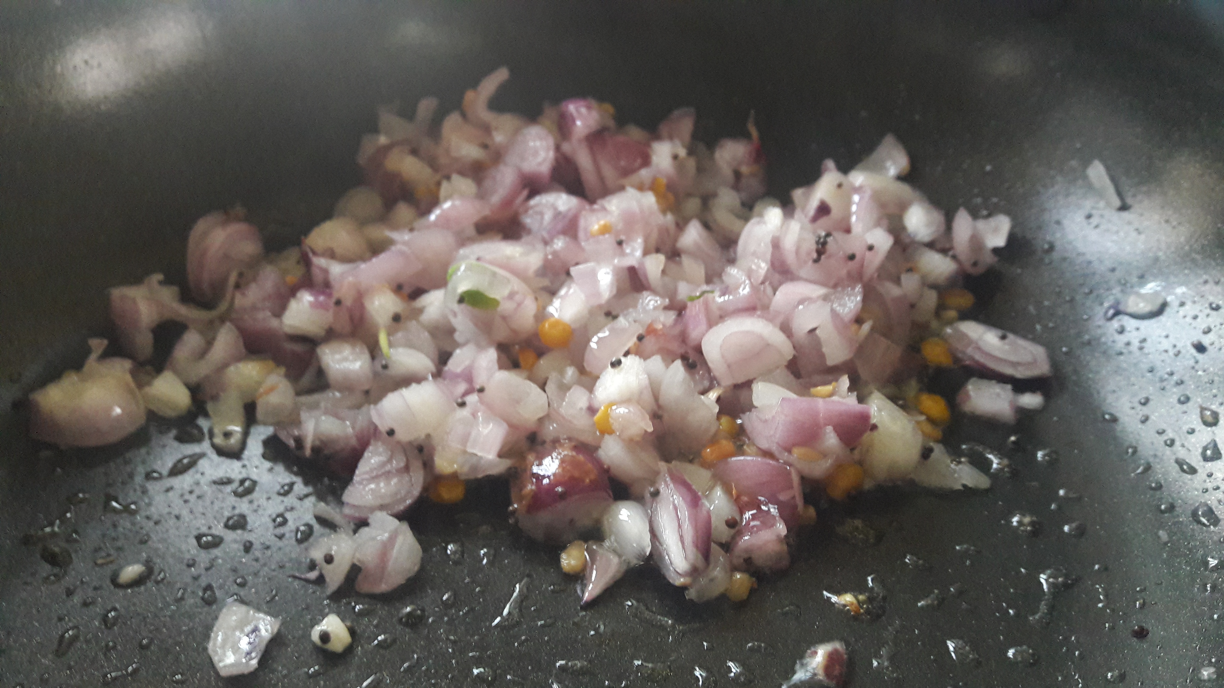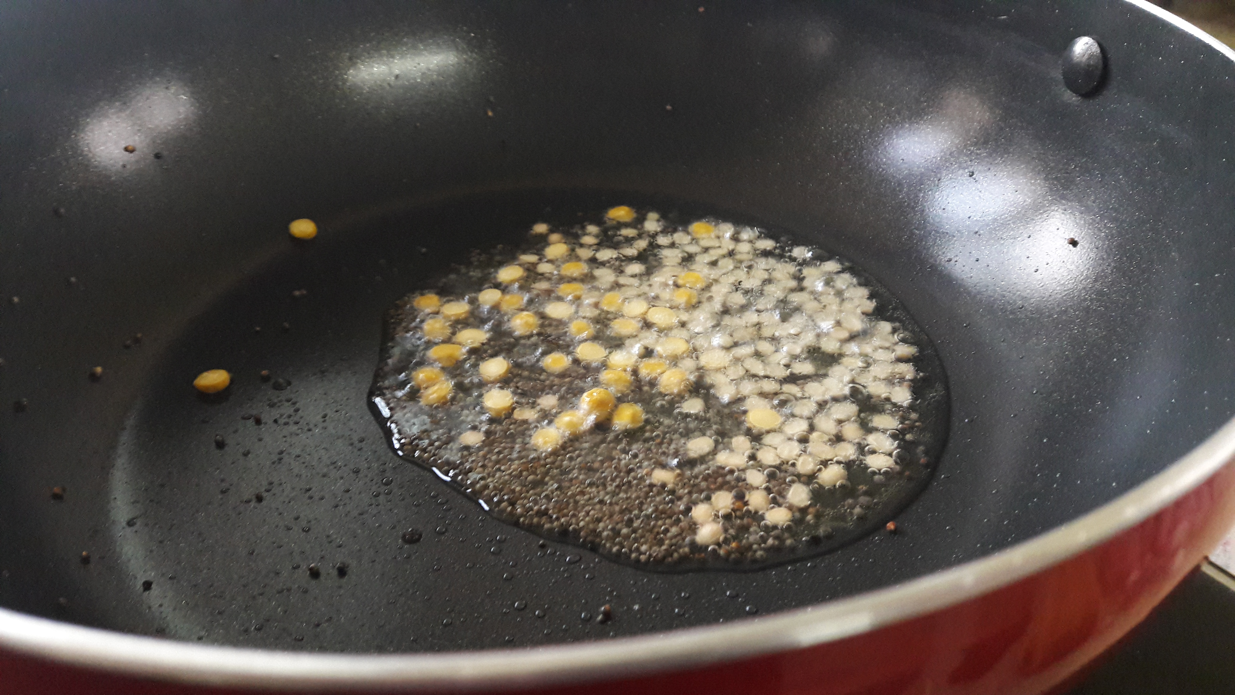 - Heat oil, splutter mustard seeds, urad dal and channa dal.