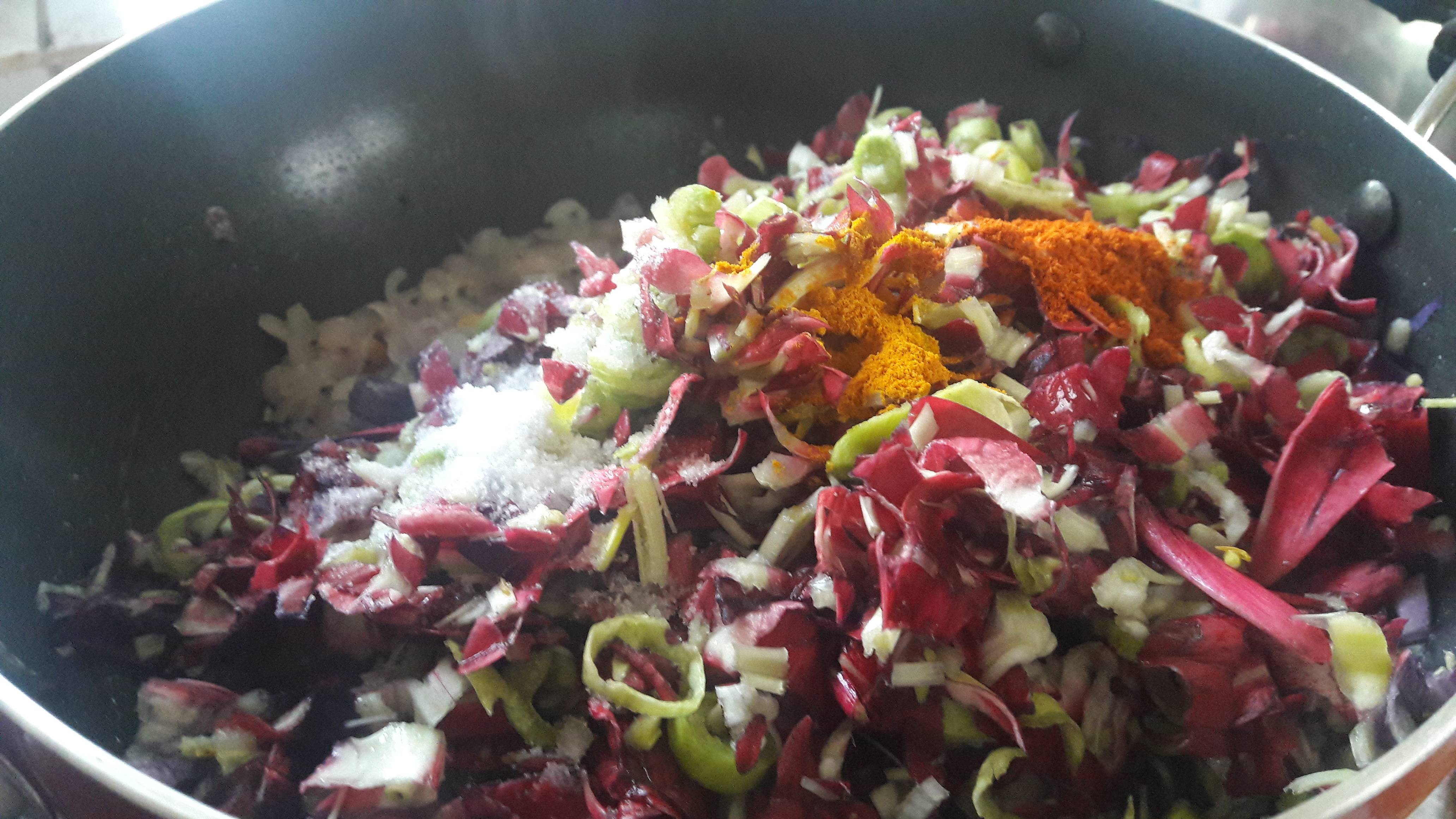 - Put in chopped agathi flowers, turmeric powder, chilly powder and salt.