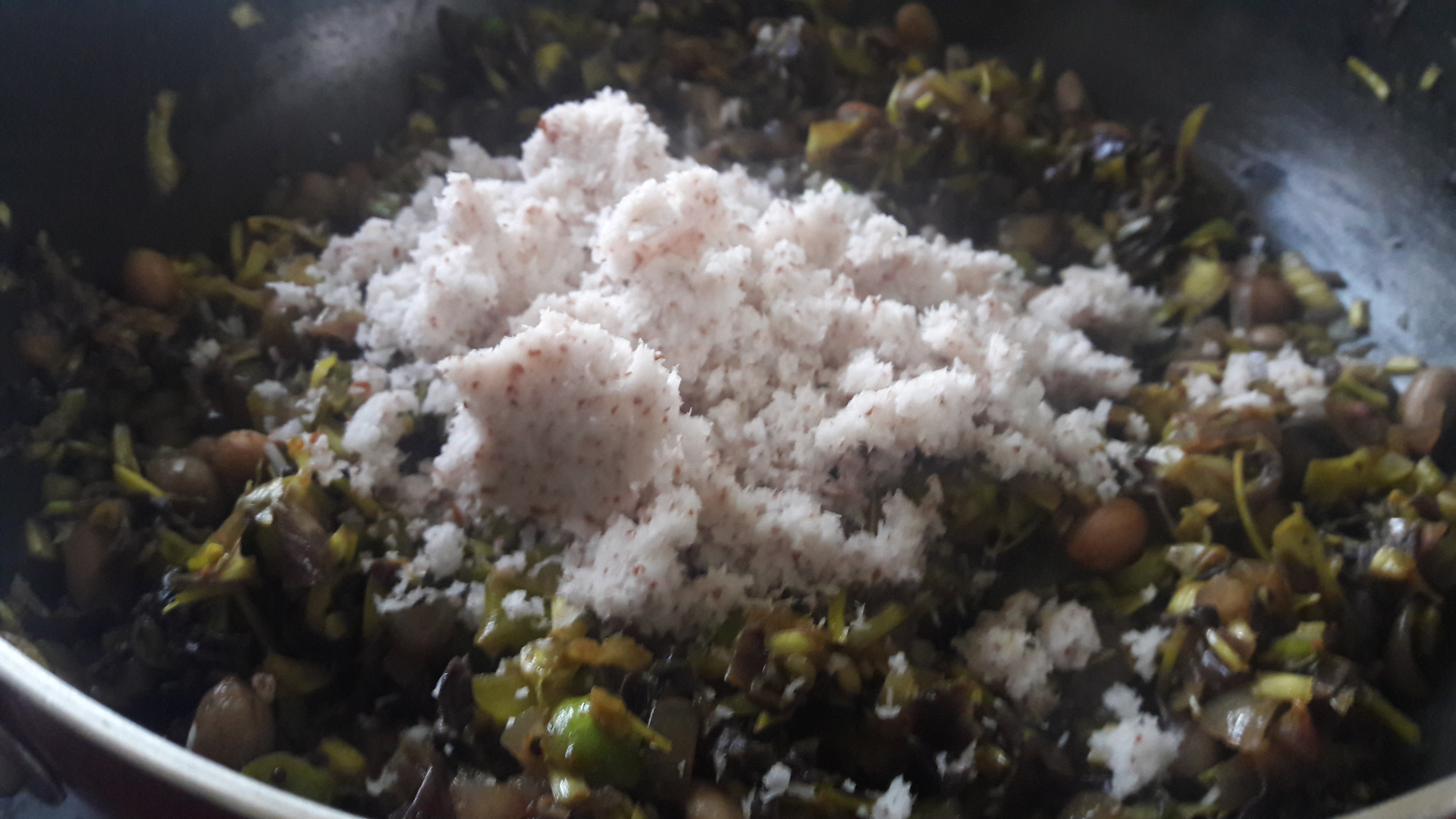 - Mix well and let it cook for a minute or two. Need not add water as the flower lets out water. Add cooked peanuts to it. We add peanuts to it to bring in some crunchiness to the stir fry. You can also roughly grind them if you do not want to add them whole. But, adding peanuts are optional and as per your preference of taste.
