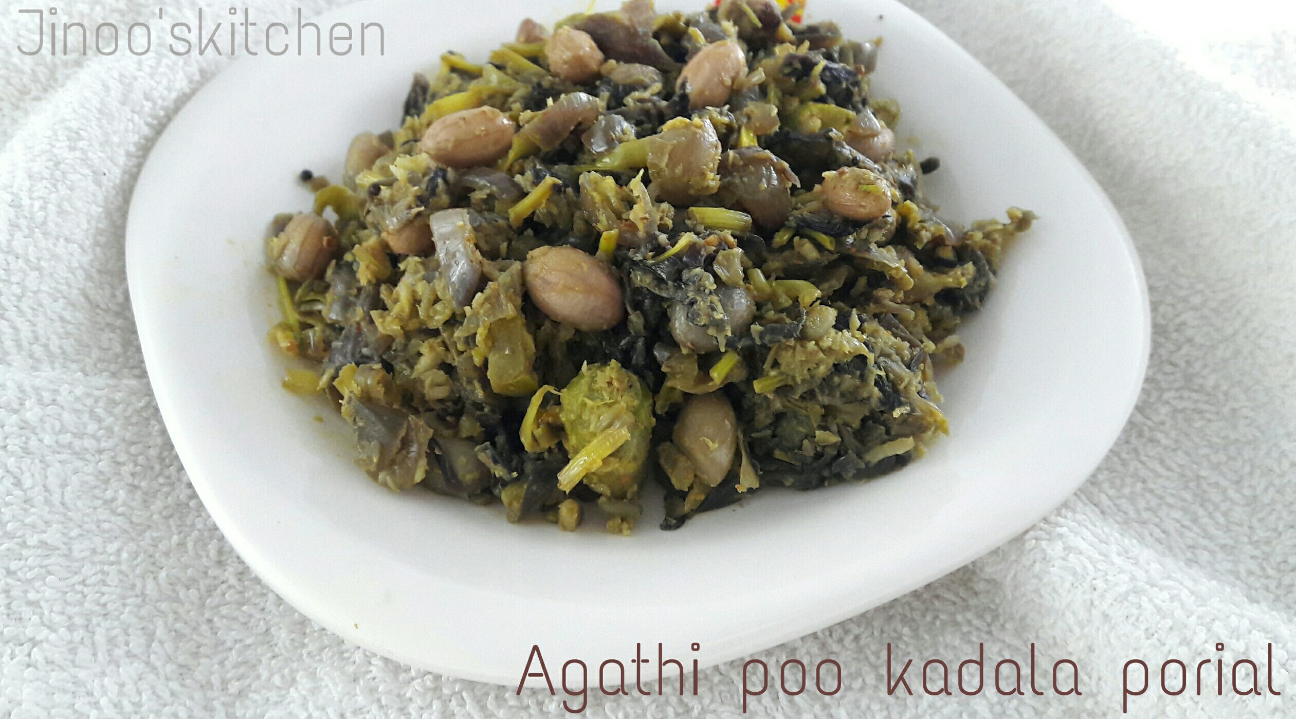 Agathipoo porial or stir fry with peanuts. Agathi poo is nothing but flowers from august tree or sesbania grandiflora. We might have often heard of Agathi keerai. This is flower of the plant and rich source of calcium. Also a very good body coolant. Unlike the leaves, flowers taste good with numerous health benefits. This recipe is with Agathi Poo(August tree flowers) and peanuts.