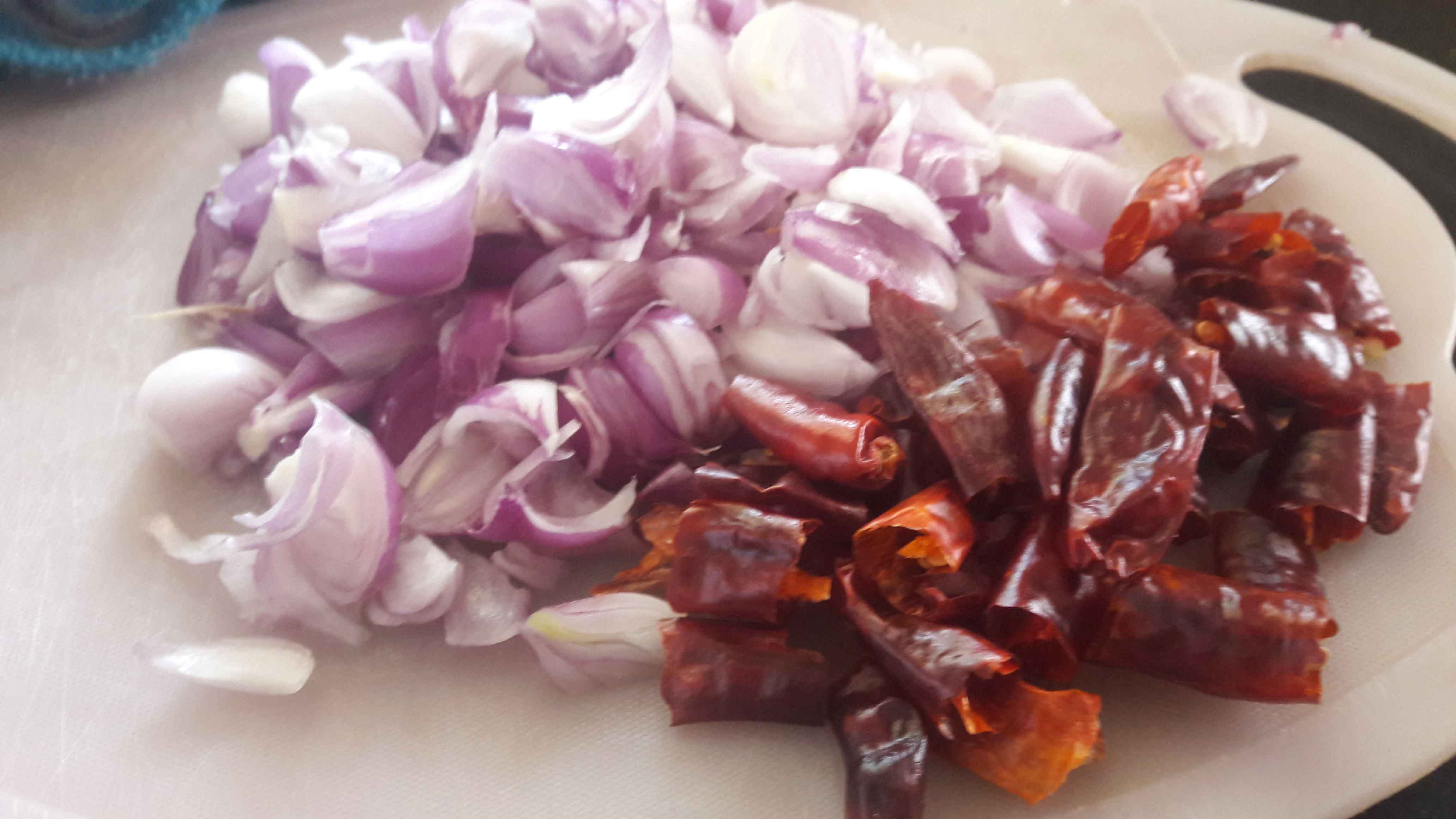 slice shallots, deseed red chillies slice coconut