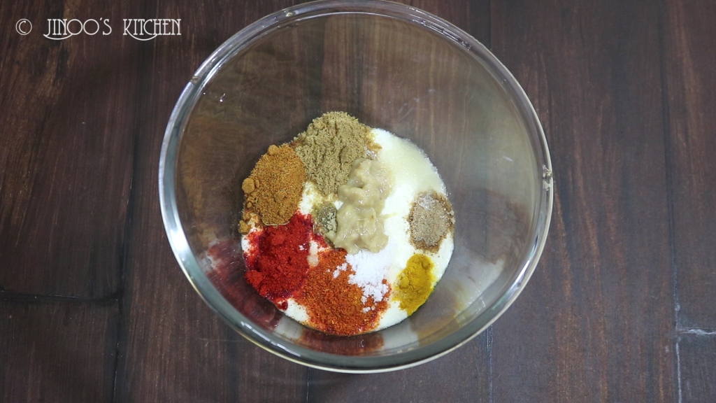 - add fresh curd, turmeric powder, chilli powder, kashmiri chilli powder, coriander powder, garam masala, amchur powder, chaat masala, sugar and salt in a bowl
