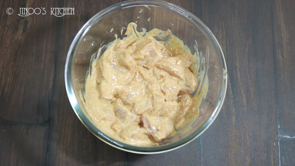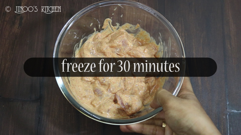 - mix well so that the masala is well coated in the chicken. when adding chicken, make sure you wash and drain it completely before adding. water in it may cause the batter too thin. refregerate it for 2-3 hours or freeze for 30 minutes