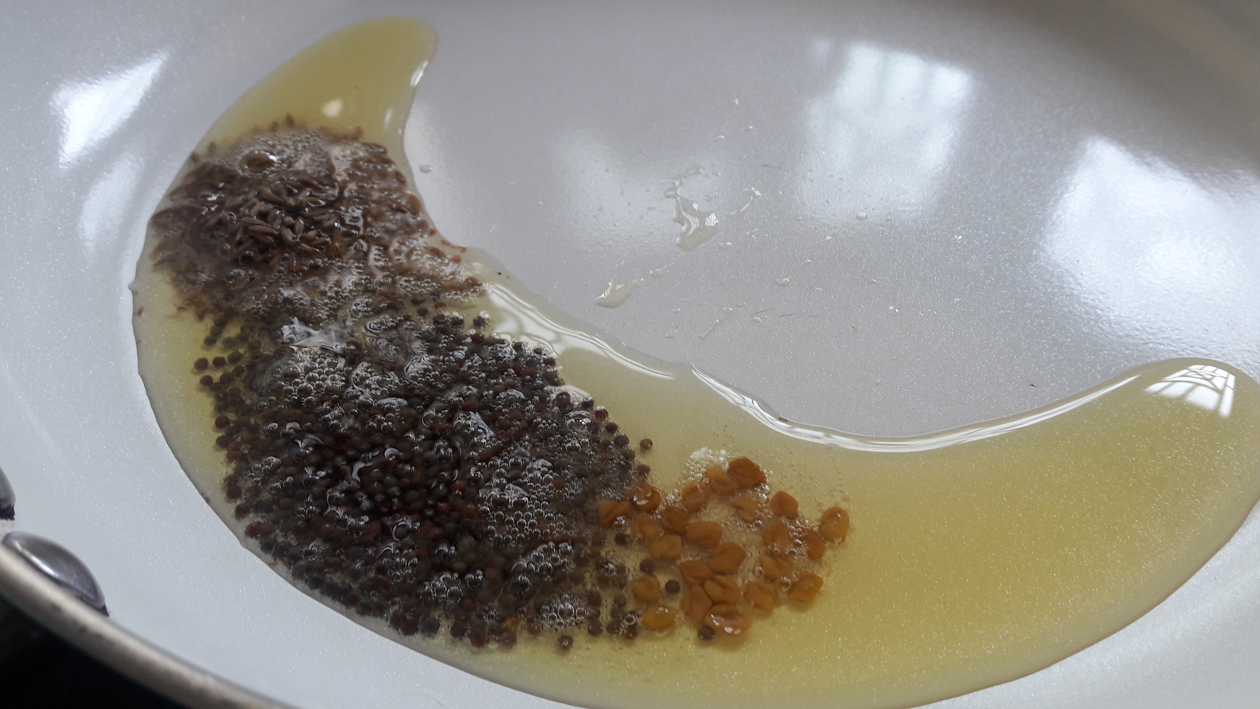 • Heat oil, crackle mustard seeds, fenugreek seeds and cumin seeds.