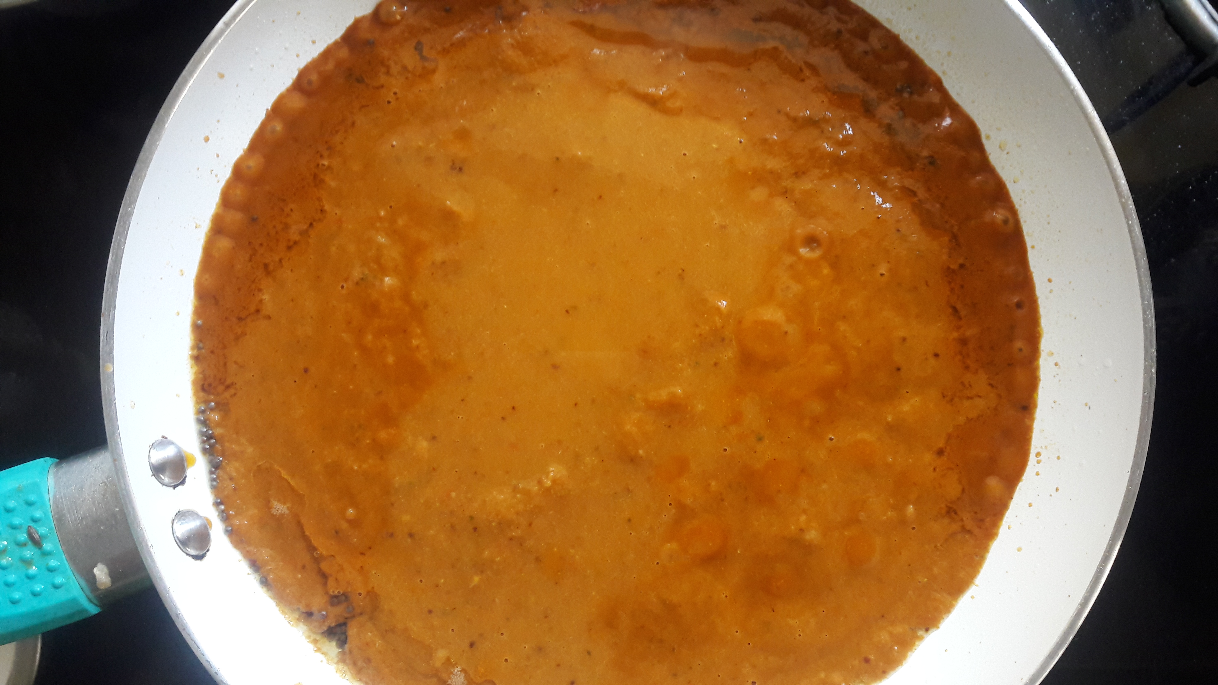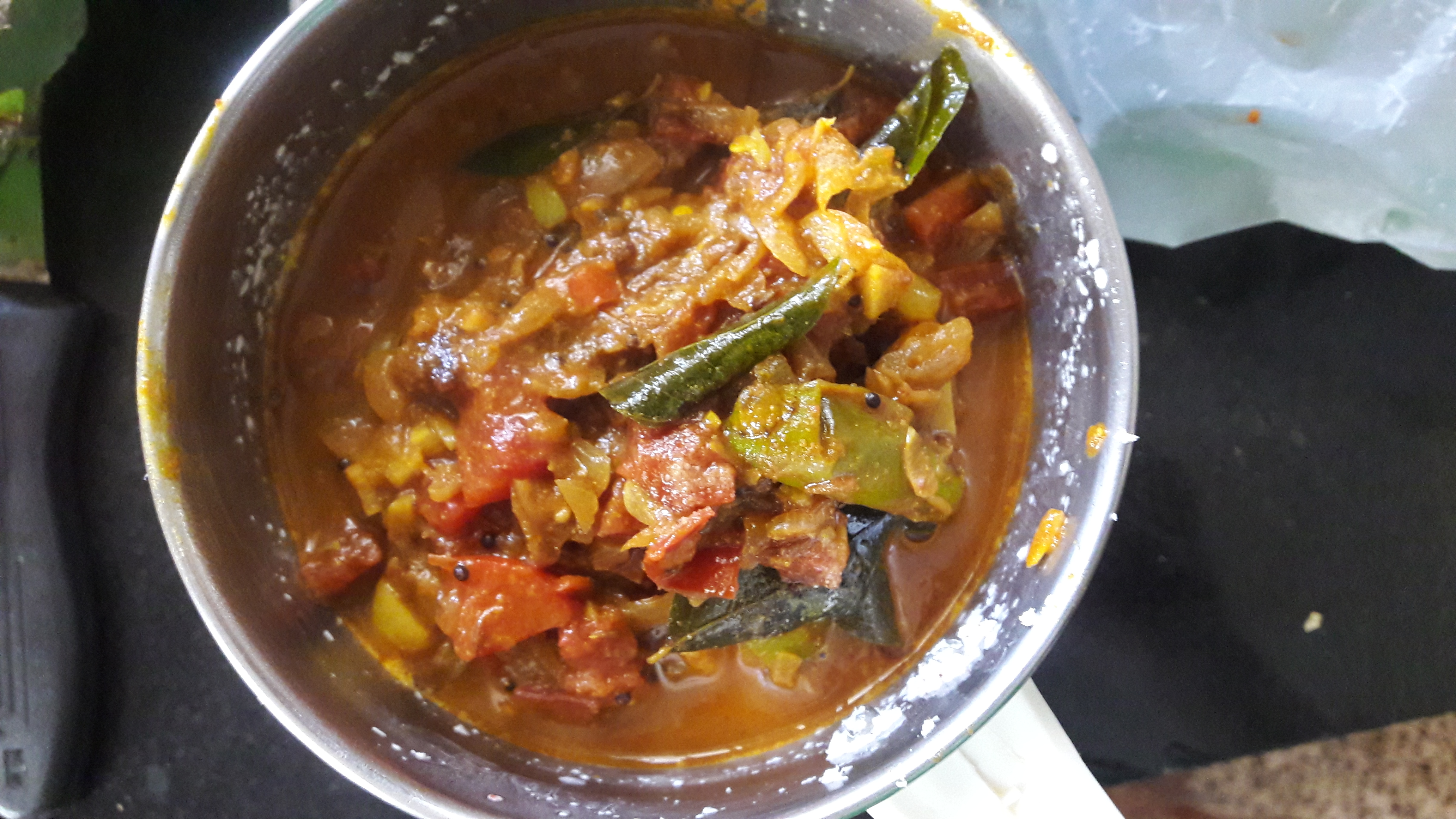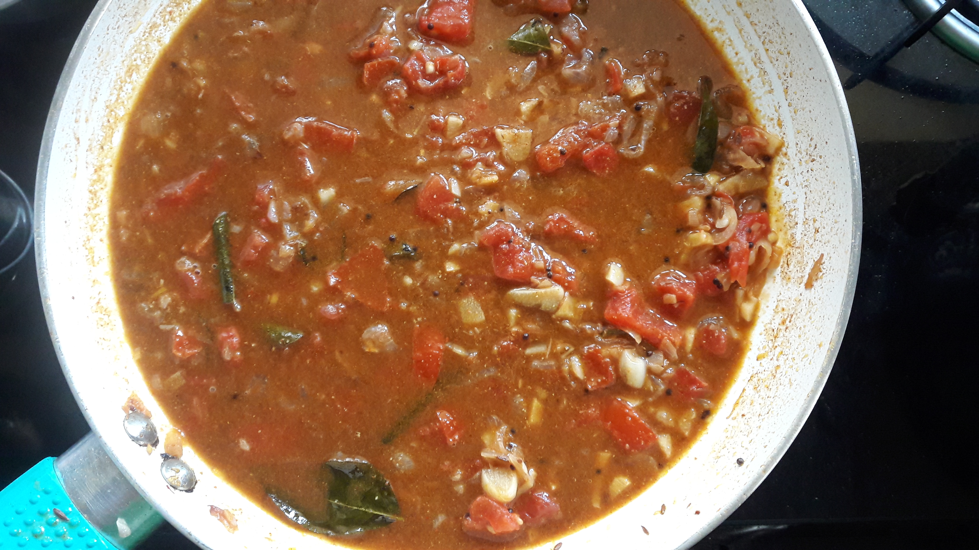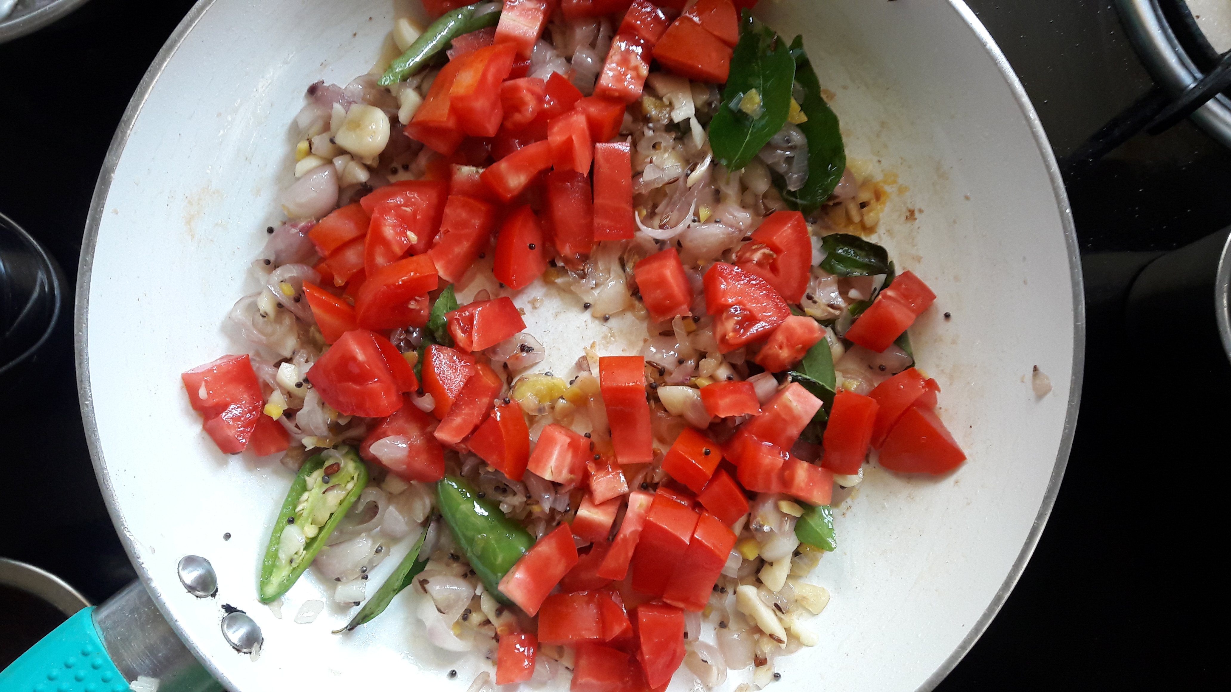 • Add in curry leaves and chopped tomato. cook till tomatoes are mushy.