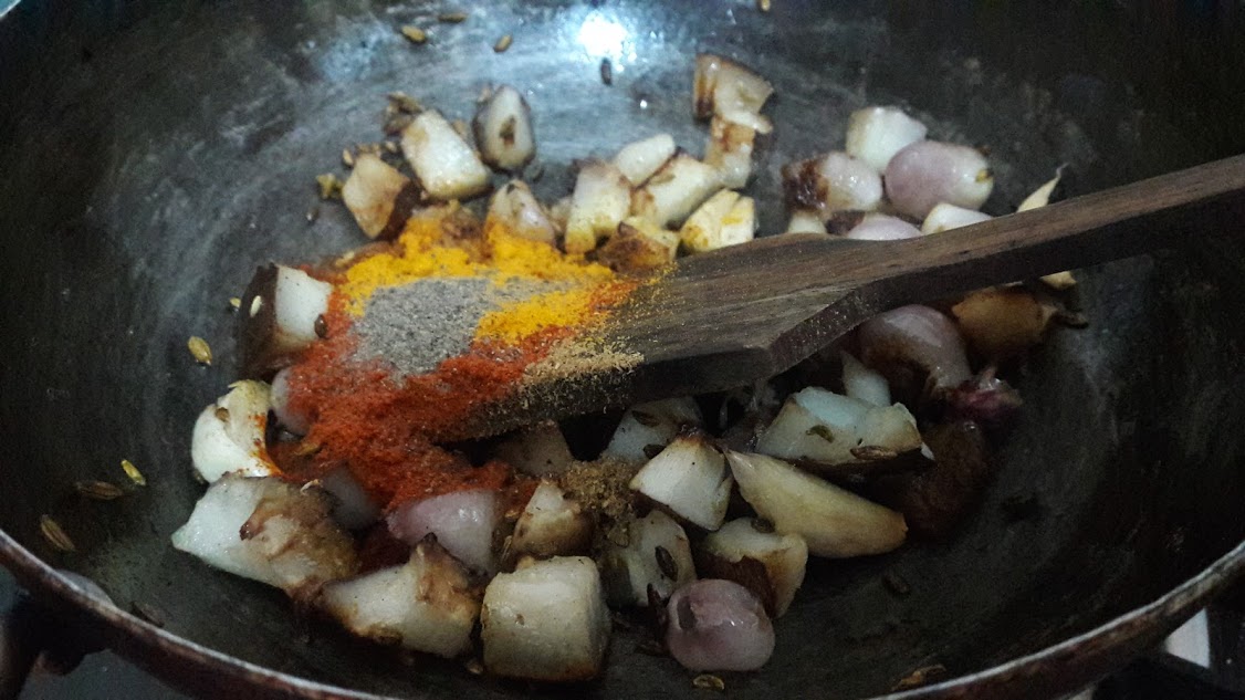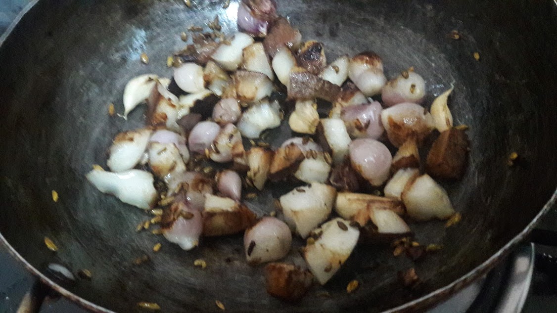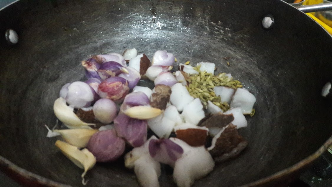 • Heat oil, roast coconut pieces, garlic, fennel seeds, cinnamon, shallots and cloves until coconut and shallots are red.
