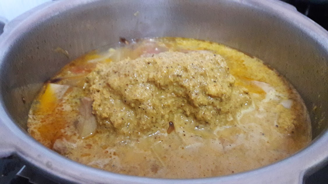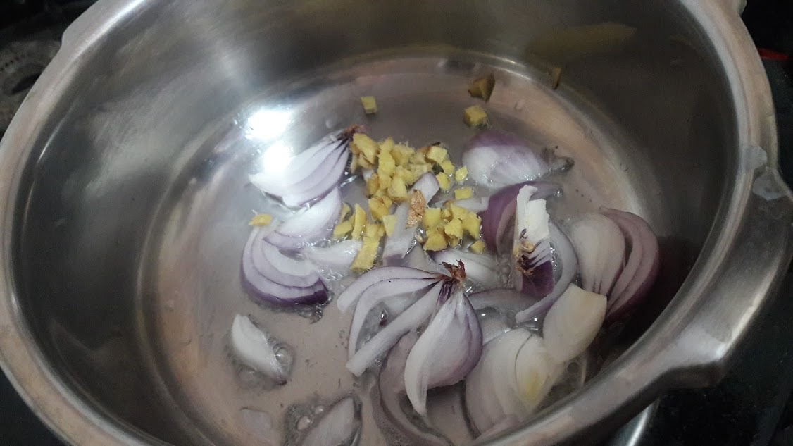 • Heat oil in a cooker, saute sliced onions, chopped ginger until onions are brown.