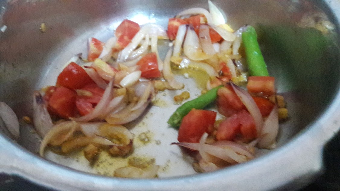 • To this, drop in chopped tomato and green chilli and fry them until tomatoes are mushy.