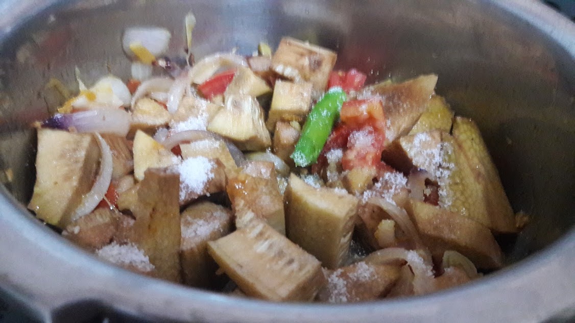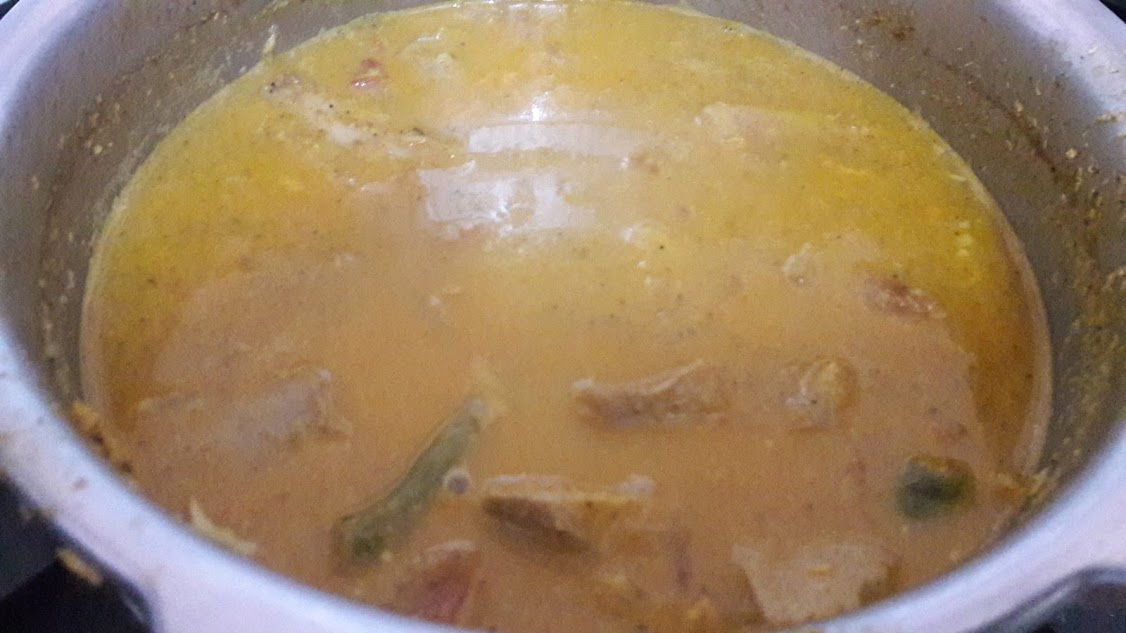 • Put in chopped jack fruit pieces and add salt and water. Cook them just for 1 whistle.