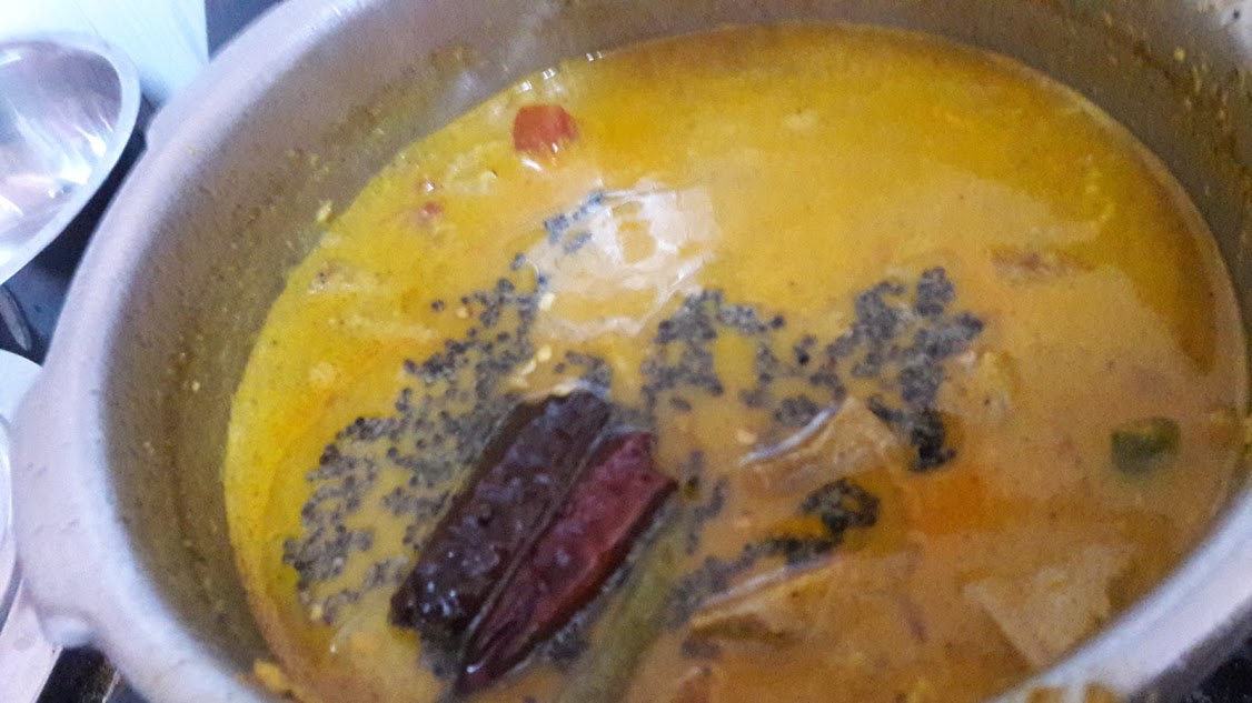 • Seasoning: crackle mustard seeds, curry leaves and red chilly and add them to curry.