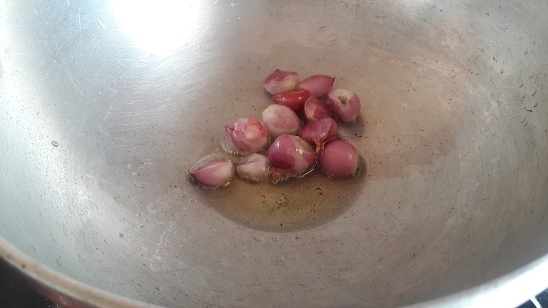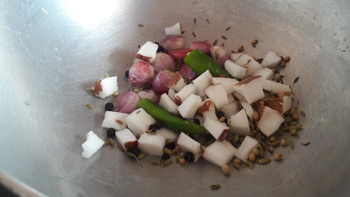 - To saute and grind: Heat oil, drop in cumin seeds, coriander seeds, peppercorns,cinnamon, clove, shallots, green chilly and coconut. if using grated coconut add it at last after shallots turn brown.
