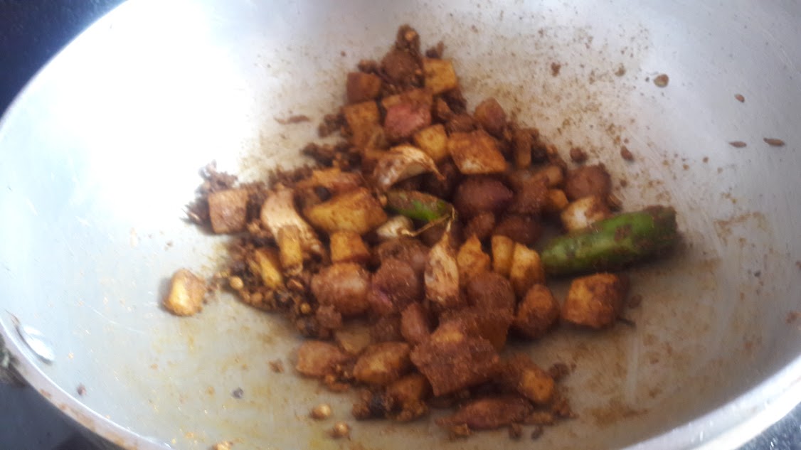 - Peel the koorka and wash it well. pressure cook with salt, turmeric powder and chilly powder to 2- 3 whistles.
