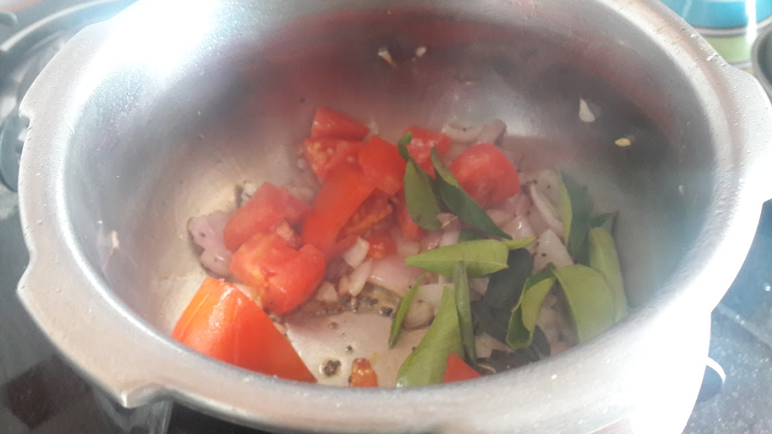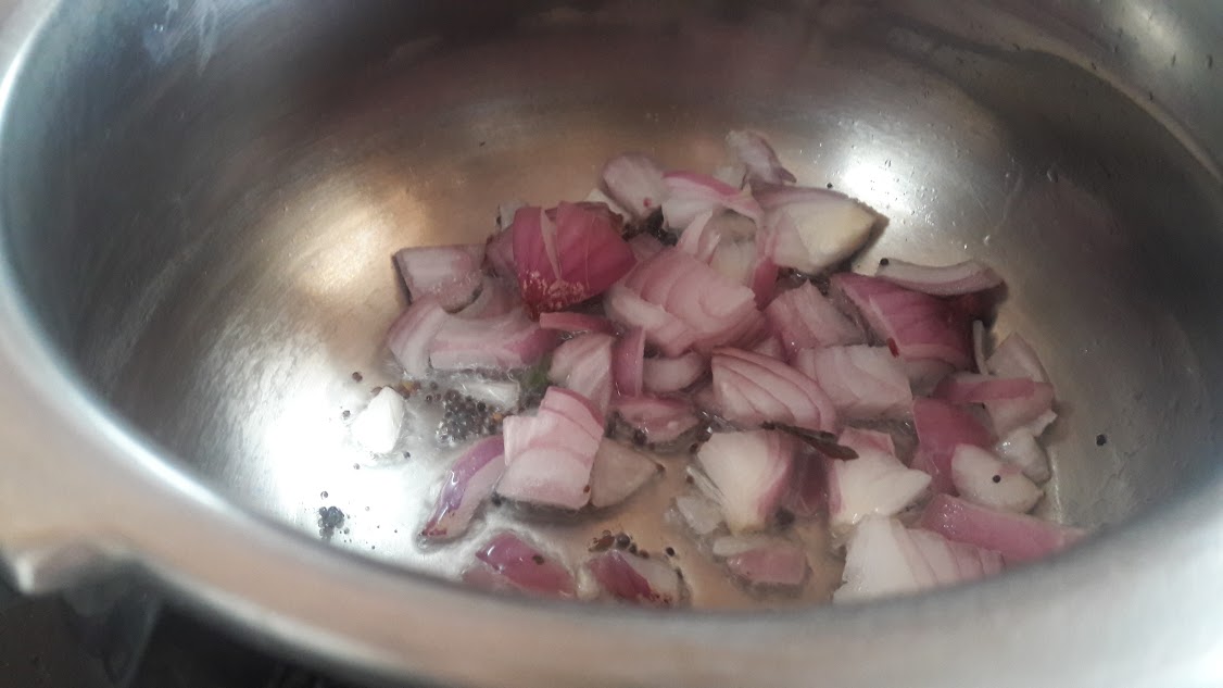 - Heat oil, splutter mustard seeds, crackle cumin seeds. saute chopped onions and chopped ginger until onions are brown. Add chopped tomatoes and saute until mushy. Curry leaves are also added along and sauteed.