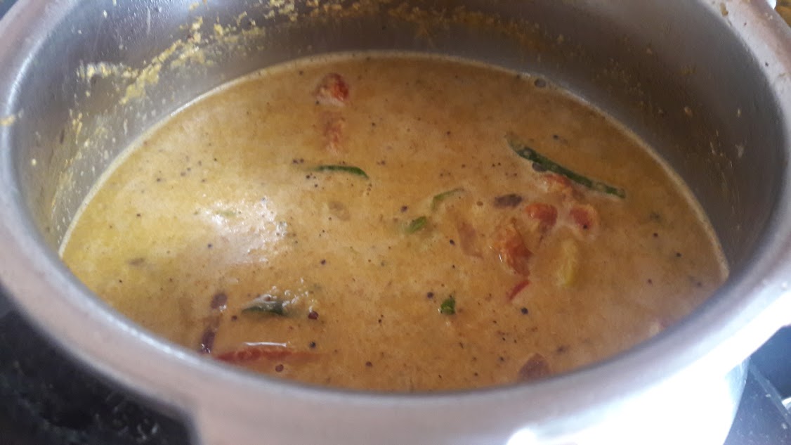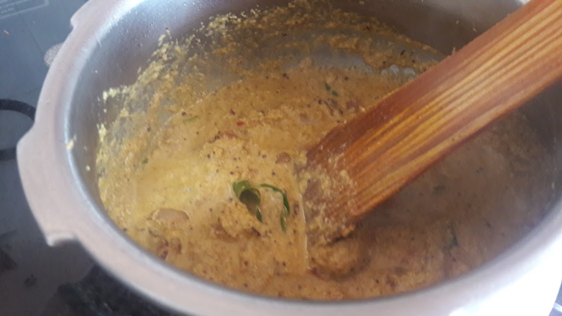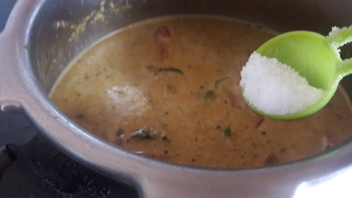 - Pour the ground masala and cooked vegetable (along with water used for cooking it). Add salt, pepper powder and curry masal powder to adjust to your spice level. Add water and pressure cook to 1-2 whistles.