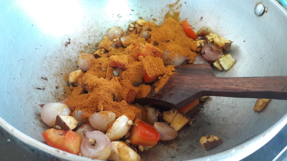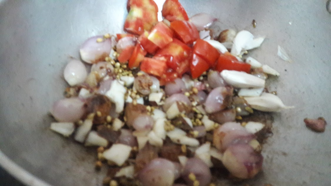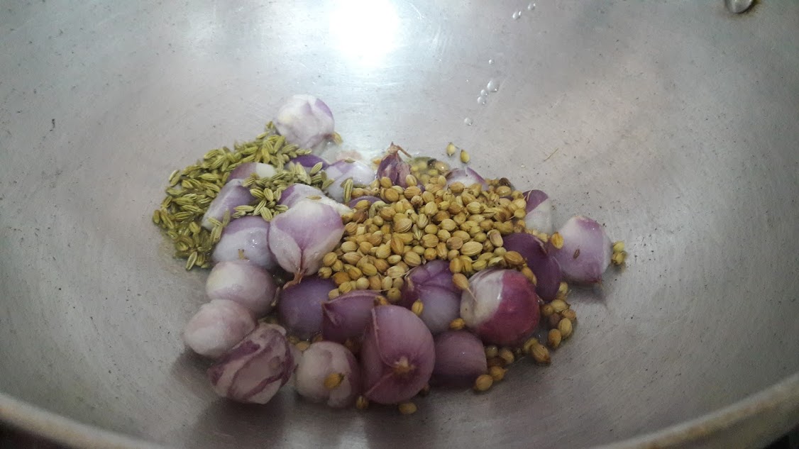 - Roast shallots, fennel seeds, coriander seeds until shallots turn brown. Put in chopped tomatoes and coconut (either grated/sliced pieces) and saute until tomatoes are mushy.