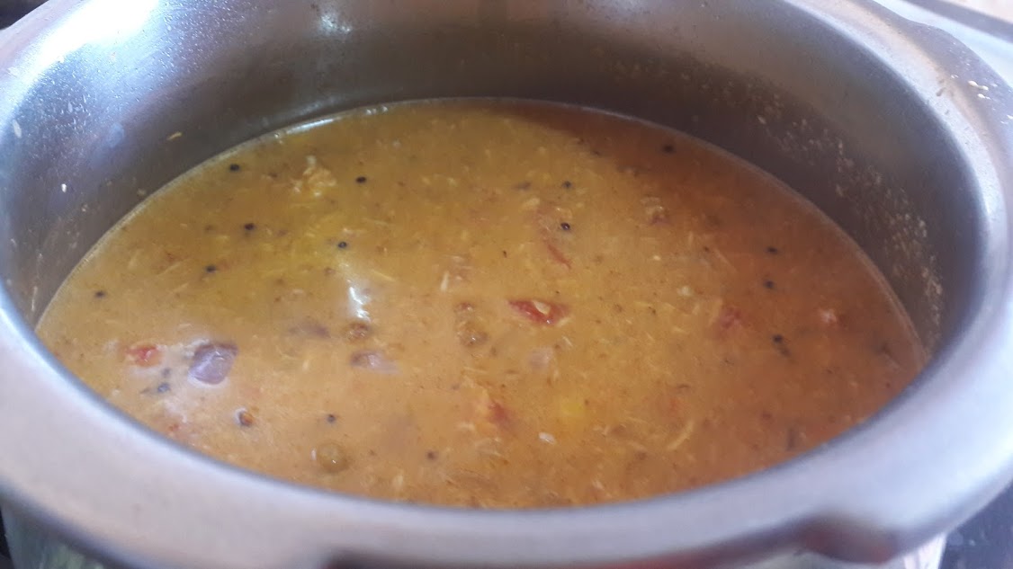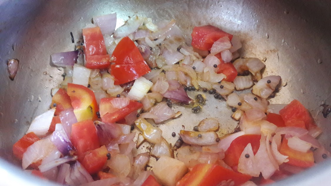 - Heat oil in a cooker, crackle mustard seeds, Add chopped onions and saute until onions are brown. Saute in tomatoes until mushy.