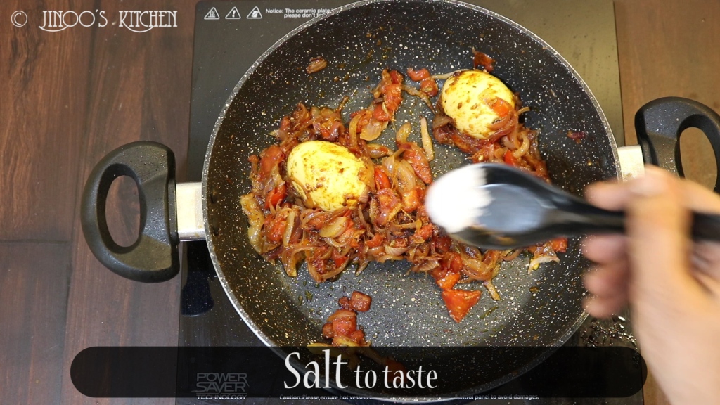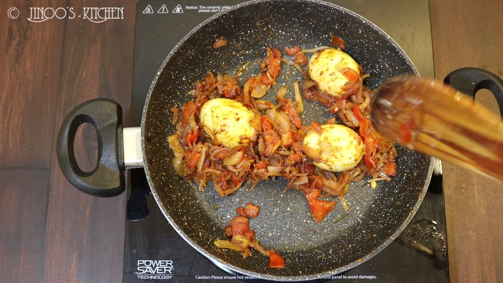 add the boiled and peeled eggs. make fine slits in egg and drop it in masala. fry again for half a minute until it is roasted.