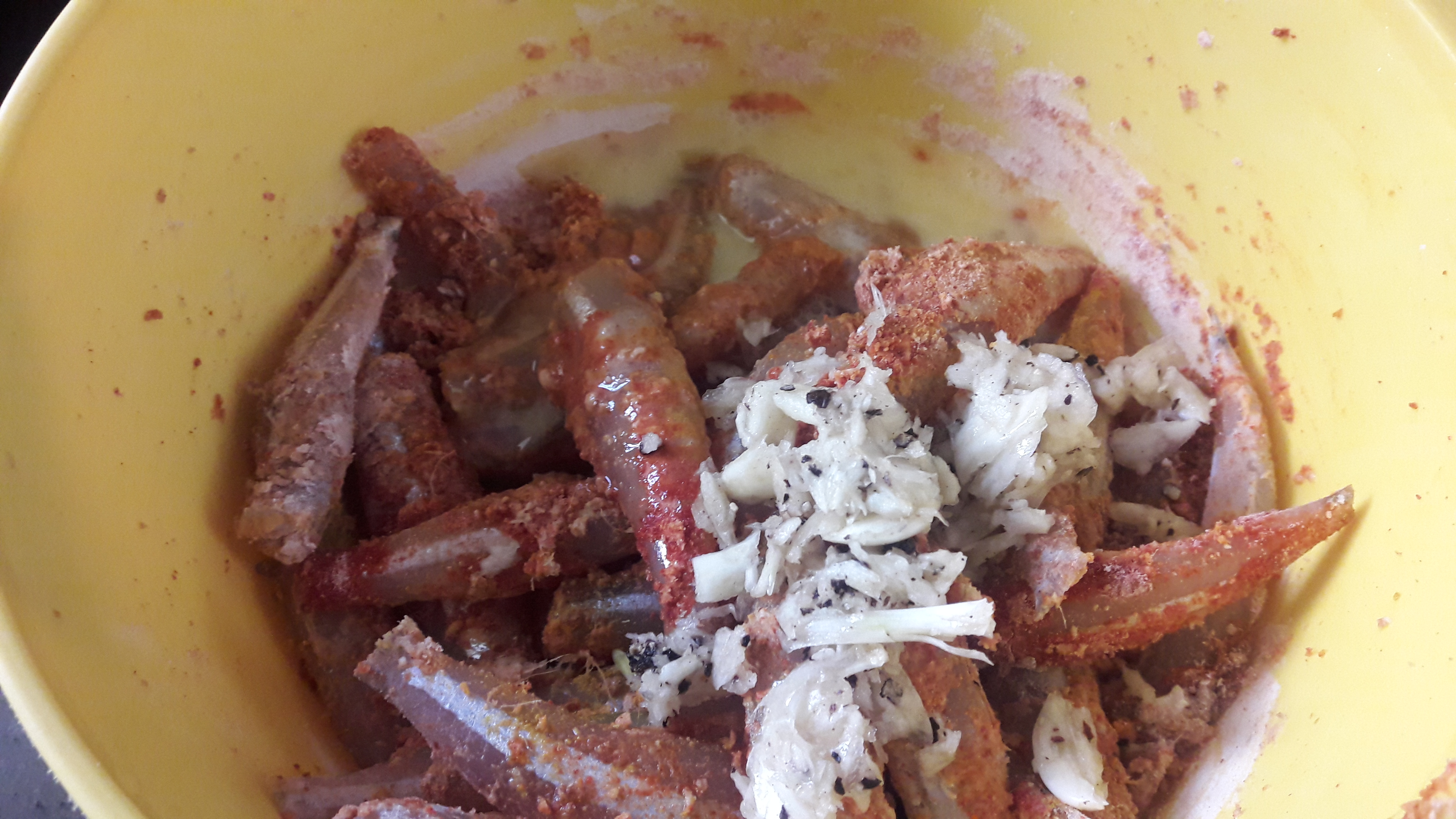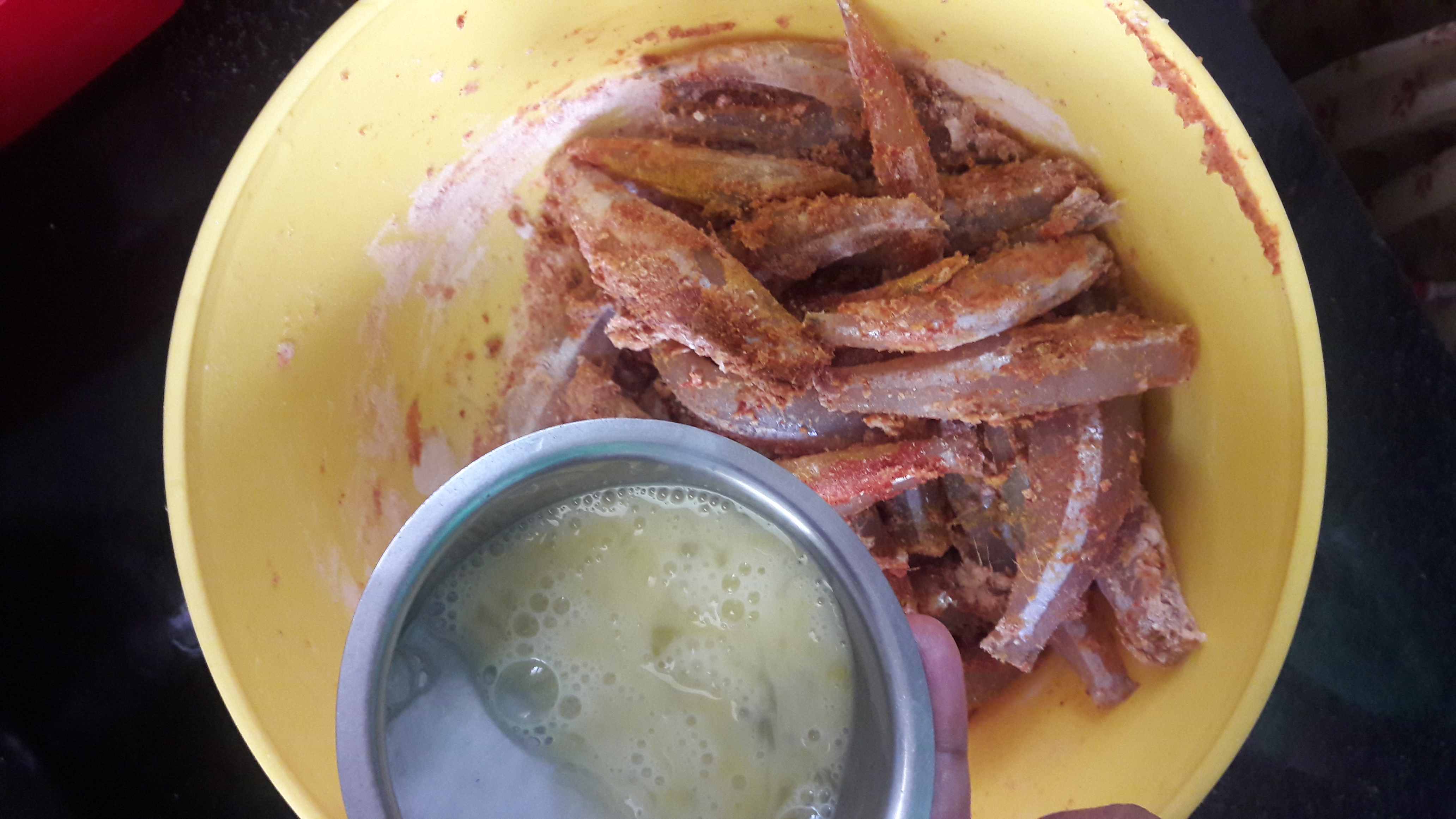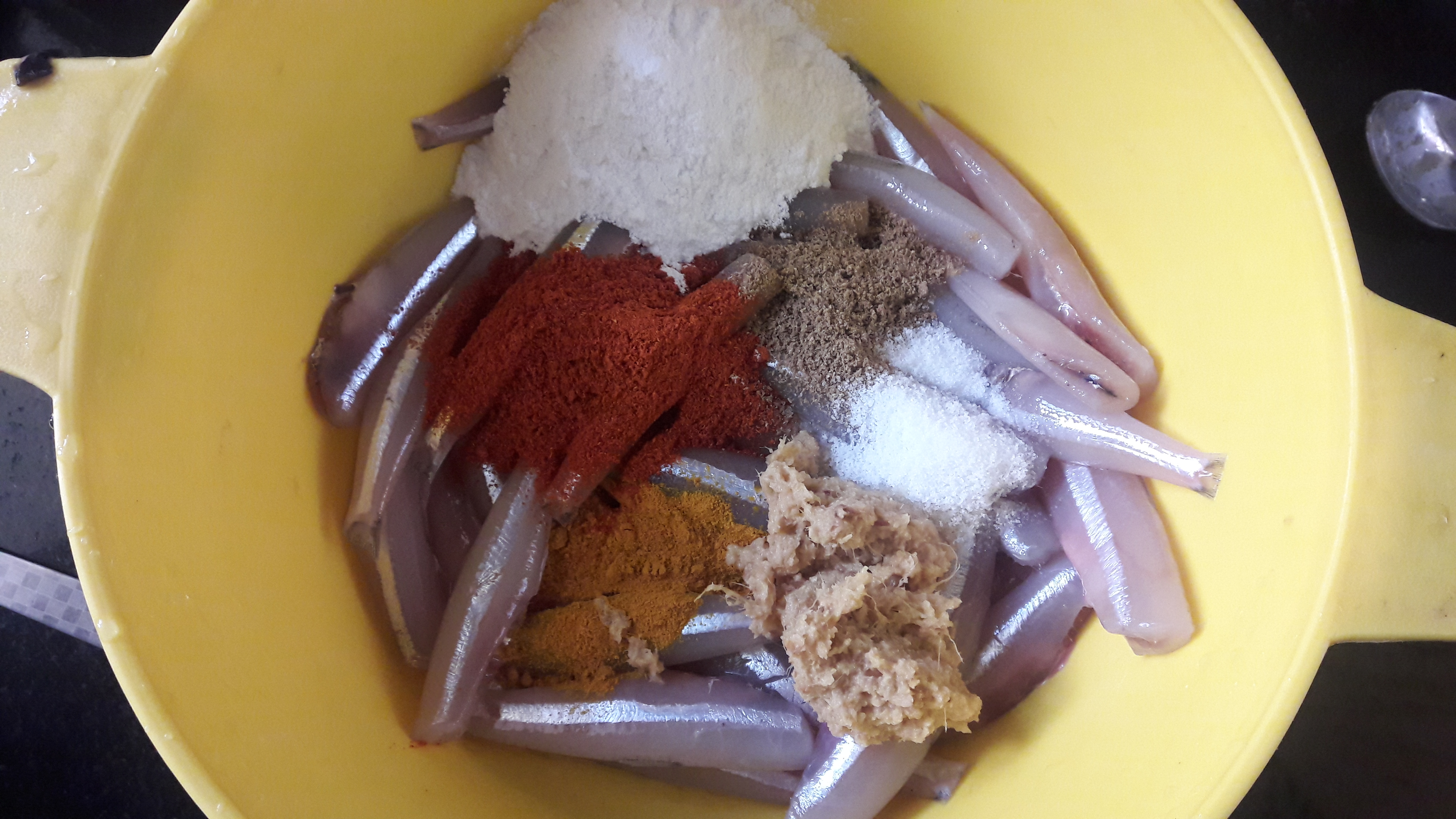 - Marinate them with turmeric powder, chilli powder, coriander powder, salt, ginger paste and rice flour.
