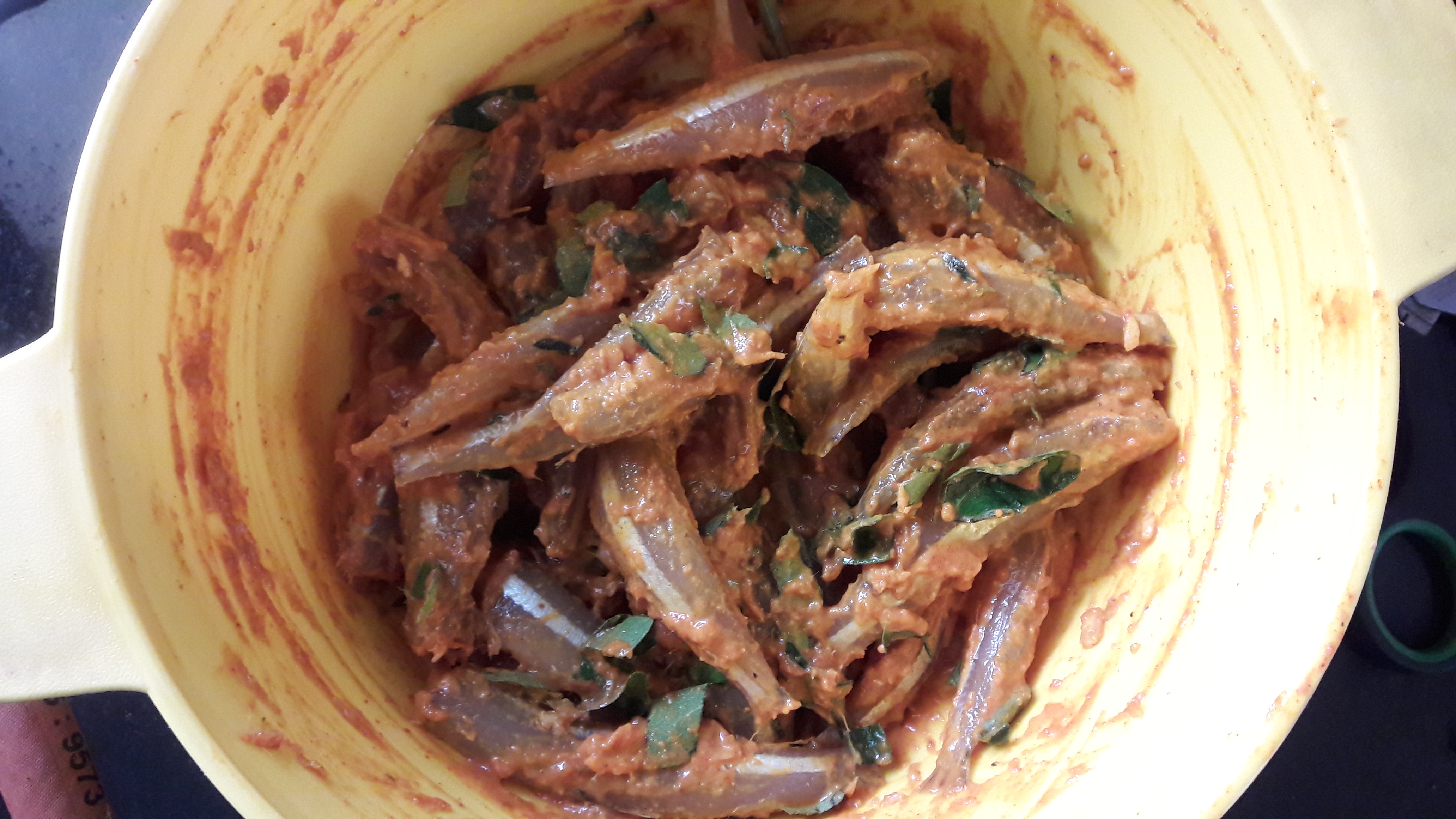 - Wash and clean the nethili fish. Marinate them with turmeric powder, chilli powder, coriander powder, salt, ginger paste and rice flour.