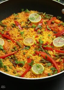Finish with fresh coriander leaves and more lemon slices. Serve the paella hot, enjoying the slightly crispy golden bottom layer for extra flavour.